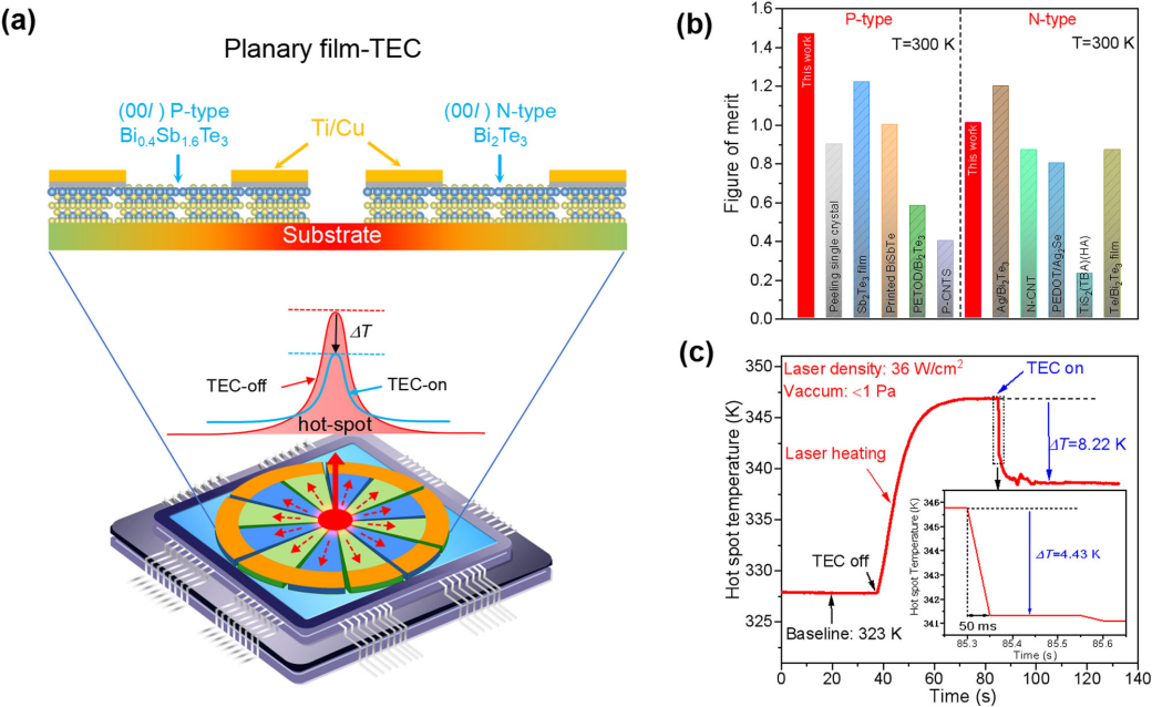 该合作团队经过3年的研发,先后解决了碲化铋热电薄膜的高取向生长、平面型热电薄膜器件的集成等关键技术,成功实现了平面型热电薄膜制冷器件在芯片热点散热上的测试验证,为新一代封装散热技术的发展提供了一种创新的解决方案。