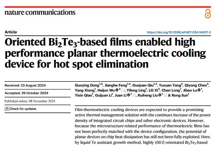 材料相变行为研究组武海军教授与中国科学院深圳先进技术研究院团队合作,在权威刊物《Nature Communications》(《自然通讯》)在线发表研究论文“Oriented Bi2Te3-based films enabled high performance planar thermoelectric cooling device for hot spot elimination”(“高取向碲化铋薄膜赋能面内热电器件用于芯片热点散热”)。一品探花