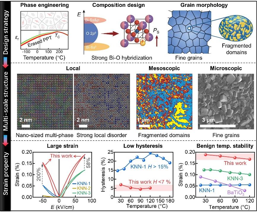 压电材料在电场作用下发生形变(即电致应变),使其在位移控制方面极具价值。特别是,具有大应变输出、最小滞后和宽工作温度范围的压电陶瓷对于高精度控制应用至关重要。遗憾的是,同时实现这三项优点,尤其是在无铅压电陶瓷中,是一项艰巨的挑战。滞后现象源于耗时较长的非180°铁电畴转换,而应变输出和工作温度则依赖于材料的相结构。为了解决这些问题,研究者们提出了多种策略,包括弛豫材料、形态弛豫边界、缺陷工程和铁电玻璃。然而,这些方法通常只能优化两项优点,许多方法仅实现了一项(例如,Science 2022, 378, 1125)。因此,同时实现所有三项优点仍然是无铅压电陶瓷研究中最主要的挑战之一。