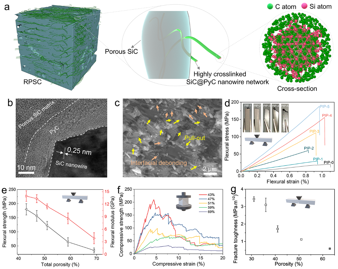针对上述问题,王红洁教授团队以单晶SiC纳米线气凝胶为基体,通过构建具有高交联程度的层状SiC@热解碳(PyC)核壳纳米线网络,结合前驱体浸渍热解法(PIP),获得了优异强韧性的多孔SiC陶瓷。该多孔SiC陶瓷因存在丰富的纳米线/PyC、PyC/多孔SiC基体间的界面,在43%气孔率下,弯曲强度达187 MPa,压缩强度为215 MPa,断裂韧性为3.4 MPa·m1/2,且具有优异的机械能吸收能力(19.3 MJ m-3)。上述成果以《强韧多孔SiC陶瓷》(Strong and Tough Porous Silicon Carbide Ceramics)为题,于近期发表在《美国化学学会·纳米》(ACS Nano)上。一品探花