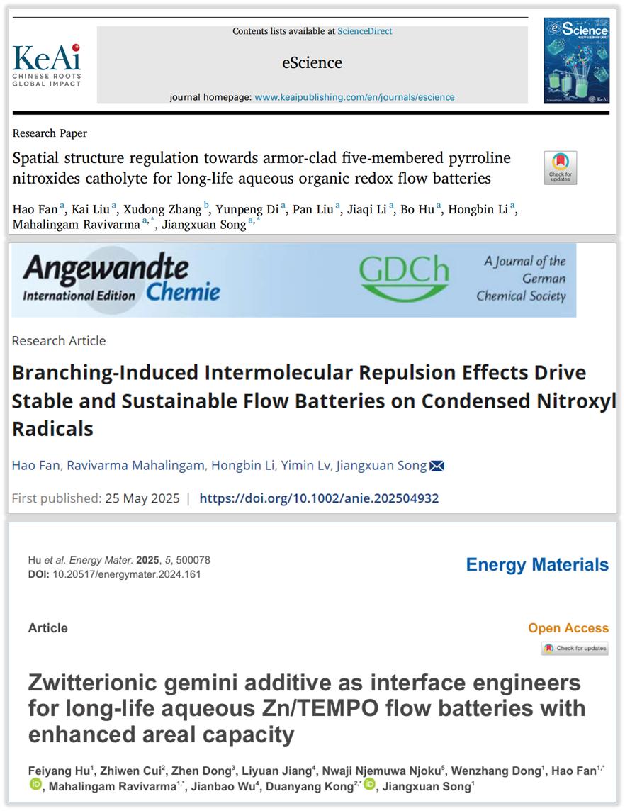 上述研究成果分别以《分子铠甲化的长寿命五元吡咯啉氮氧自由基类液流电池正极电解质》(Spatial structure regulation towards armor-clad five-membered pyrroline nitroxides catholyte for long-life aqueous organic redox flow batteries)和《分子支链调控驱动氮氧自由基稳定转化,助力构建高性能水系液流电池》(Branching-Induced Intermolecular Repulsion Effects Drive Stable and Sustainable Flow Batteries on Condensed Nitroxyl Radicals)为题发表在国际期刊《电科学与能源科学》(eScience)和《德国应用化学》(Angewandte Chemie International Edition)上;材料科学与工程学院范豪副教授为论文第一作者,宋江选教授为通讯作者,一品探花