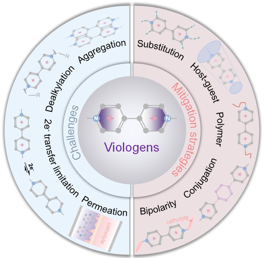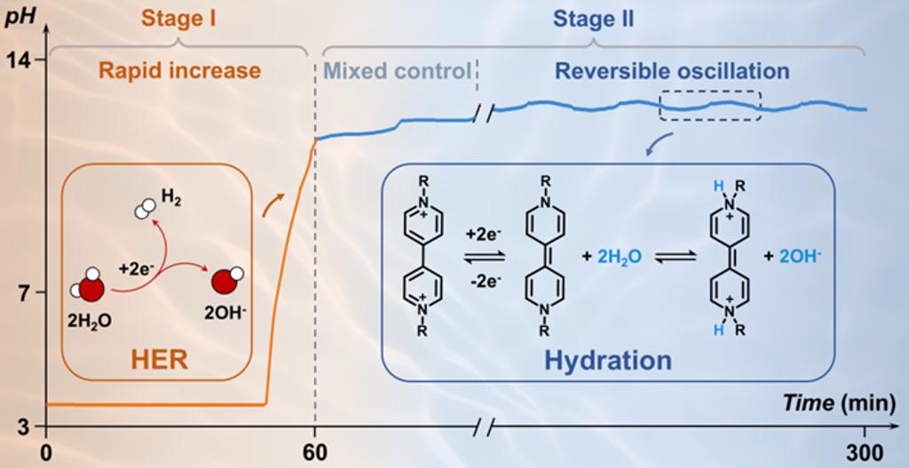 紫精类活性分子以其成本低、水溶性高、氧化还原可逆性优良等特性,是目前水系有机液流电池中应用最广的负极活性材料之一。然而,在长期充放电循环中,紫精类电解液容易发生起源不明的碱化反应,导致分子降解和容量快速衰减,严重影响电池的运行寿命。该问题在两电子转移条件下尤为突出,不仅限制了第二电子的有效利用,也制约了体系能量密度的进一步提升。因此,深入理解其碱化机制是提升紫精类水系有机液流电池综合性能的关键。