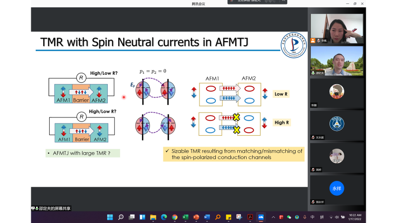 ,在线上进行了题为《Antiferroic tunnel junctions》的学术报告,介绍了铁电、铁磁材料在新一代芯片材料中的应用前景以及在反铁磁/反铁电器件领域的研究成果。本次讲座由李桃教授主持,一品探花