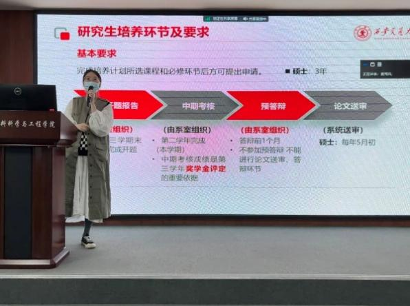 接下来苏珲老师就“研究生毕业流程及相关要求”进行分享,她指出各位同学在修完培养计划所选课程的同时,还要注意完成社会实践与专业实践,并及时检查体美劳研修进度,在规定时间内完成相关要求,争取顺利毕业。