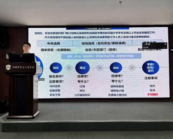 已签约武汉东湖新技术开发区工作委员会的官家达同学为大家详细介绍了选调、人才引进及其他方面的基本情况,他强调同学们要立足自身、清楚定位、做好选择,并建议早做准备、紧跟时事、注重积累,增强自身理论修养和政治素养,用实际行动践行西迁精神。