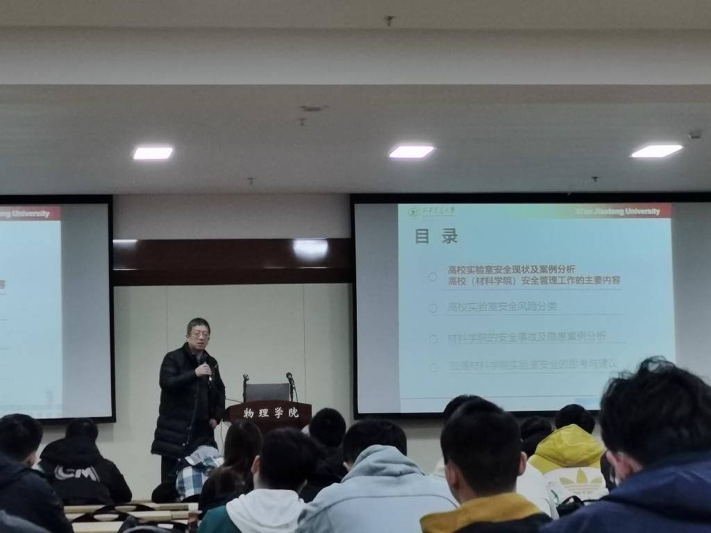 实验安全的思考与建议几个方面,对学院安全管理制度、实验室环境安全和个人防护、化学品安全、机械品安全、消防安全、用电安全等方面做了细致、全面的安全教育培训。他提醒同学们保护好自己,为自己的安全负责,重视实验室安全,严格遵守学校、学院的安全管理制度和实验室准入制度,认真学习安全常识和必备技能,保护个人生命、财产安全。