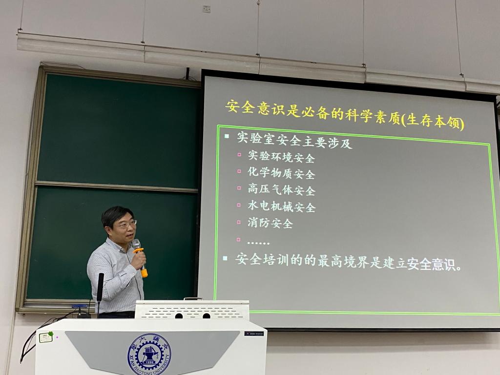 院长助理朱晓东从实验室环境安全和个人防护、化学品安全、机械品安全、消防安全等方面对全体同学开展了细致、全面的安全教育培训。安全培训的最高境界是树立安全意识,希望通过本次培训,同学们重视实验室安全,严格遵守学校、学院的安全管理制度和实验室准入制度,认真学习安全常识和必备技能,保护个人生命、财产安全。