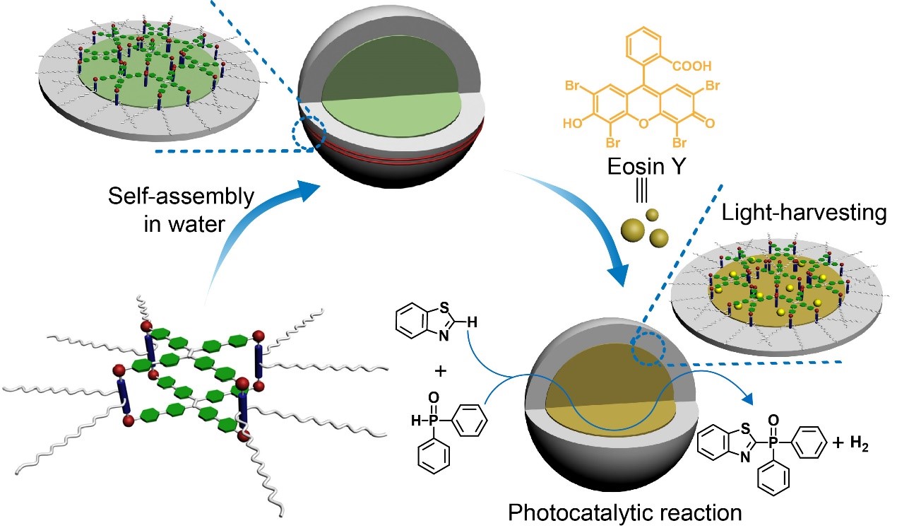 05-08光合作用是地球上能量的主要来源。大部分植物和细菌通过这一过程完成对太阳能的吸收、捕获、转移和储存。在这个过程中,光能被密集的叶绿素分子阵列捕获并汇集到反应中心,然后转化为化学能。为了开发清洁和可持续的能源,目前越来越多的科研团队致力于模拟荧光共振能量转移(FRET)这一过程来构建人工光捕获体系,然而利用所捕获的光能进行光催化反应的研究鲜有报道。鉴于自然界中光合作用也是利用收集的光能进行化学反应,发...