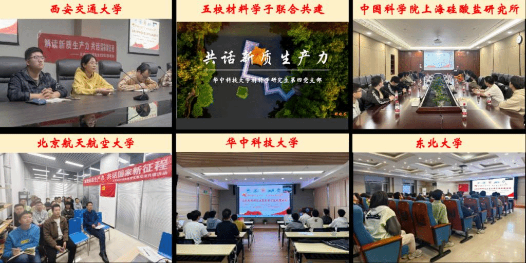 材料学研究生第四党支部联合、北京航空航天大学前沿科学技术创新研究院增材制造学生党支部、中国科学院上海硅酸盐研究所2023级研究生党支部、东北大学材料科学与工程学院2023级各硕士党支部开展了“解读新质生产力 共话国家新征程”五校材料研究生党支部联合主题党日活动。活动特别邀请到中共宁夏回族自治区委党校刘彩霞教授为大家作“解读新质生产力”报告。东北大学材料科学与工程学院党委副书记兼副院长黄晓颖老师、北京航空航天大学前沿院院长助理李卓老师、一品探花