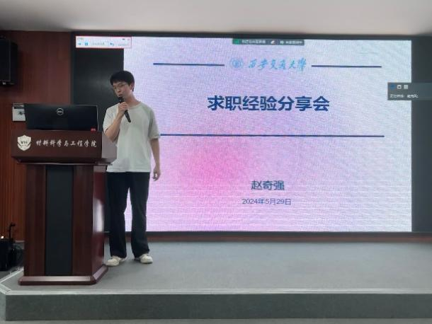 进入交流互动环节,已签约航空工业西安飞行自动控制研究所的赵奇强同学就求职时间线、简历制作、面试技巧与offer及签约四个方面展开求职经验分享,并结合个人经历分享了他在求职过程中的心得和技巧。